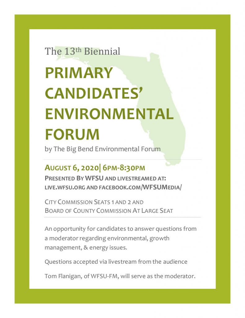 The Big Bend Environmental Forum is hosting a candidates’ forum for local candidates, including the Leon County Commission and Tallahassee City Commission. Citizens will be able to submit questions covering environmental, energy, sustainability, and growth management issues. The Big Bend Environmental Forum is a coalition of 15 conservation, community, smart growth, and sustainable organizations working to protect and improve the communities in the Big Bend Region.